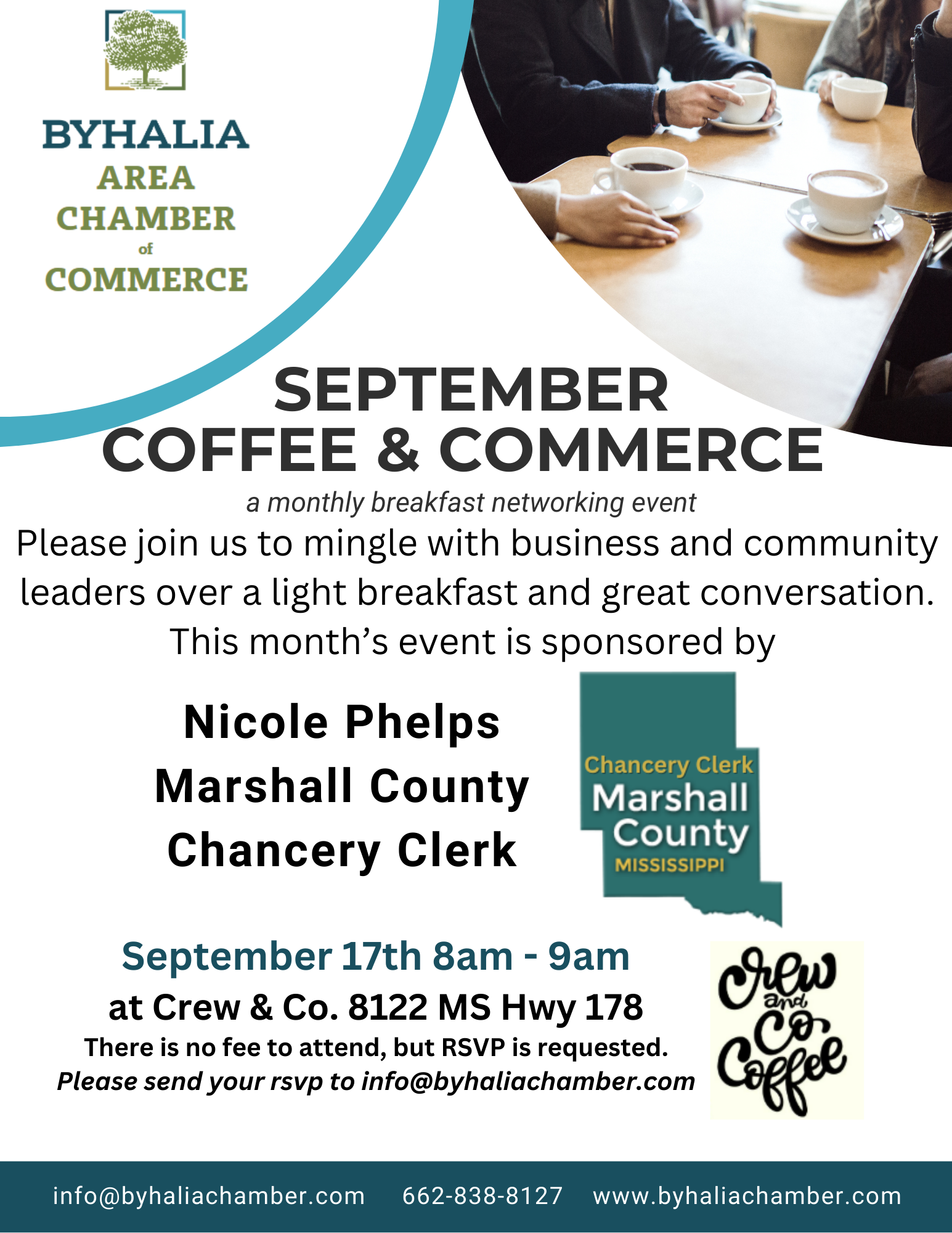 Please join us for our monthly Coffee & Commerce on September 17th where you can mingle with business and community leaders over a light breakfast and great conversation. This month's event will be sponsored by Nicole Phelps, the Marshall County Chancery Clerk. The event will be held from 8am-9am at Crew & Co located at 8122 MS Hwy 178. There is no fee to attend, but RSVP is requested in advance. Please send your rsvp to info@byhaliachamber.com