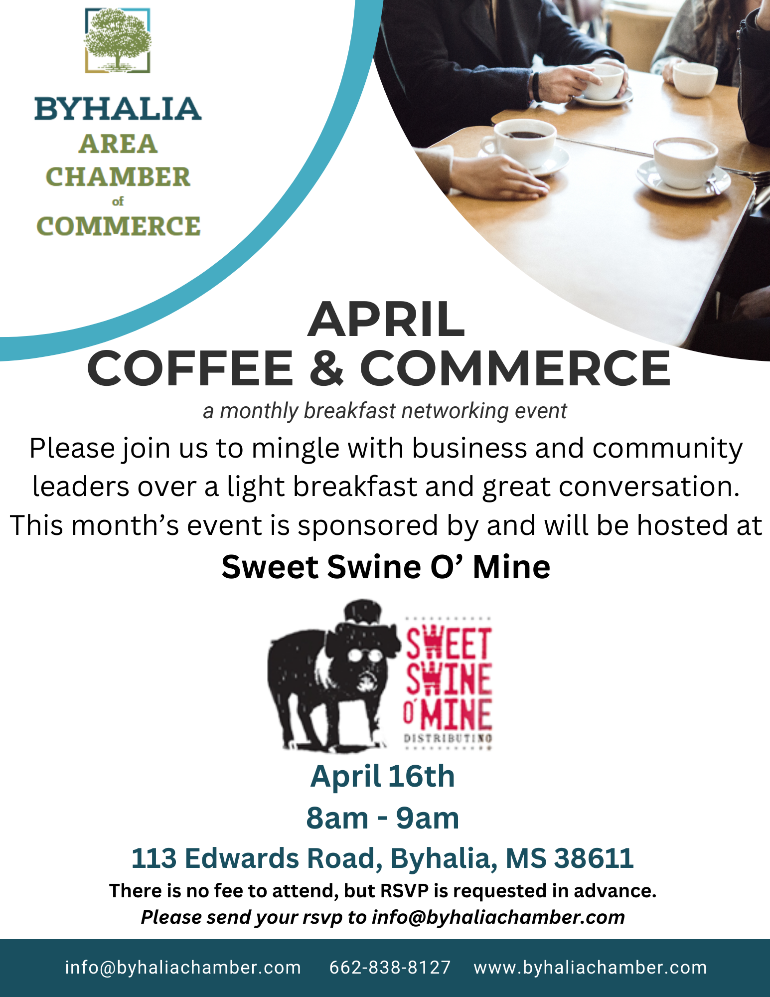 Join us for our monthly Coffee & Commerce on April 16th from 8AM-9AM where you can mingle with business and community leaders over a light breakfast and great conversation. This event is sponsored by and will be held at Sweet Swine O' Mine. The address is 113 Edwards Road. There is no fee to attend, but RSVP is requested in advance. Please send your rsvp to info@byhaliachamber.com