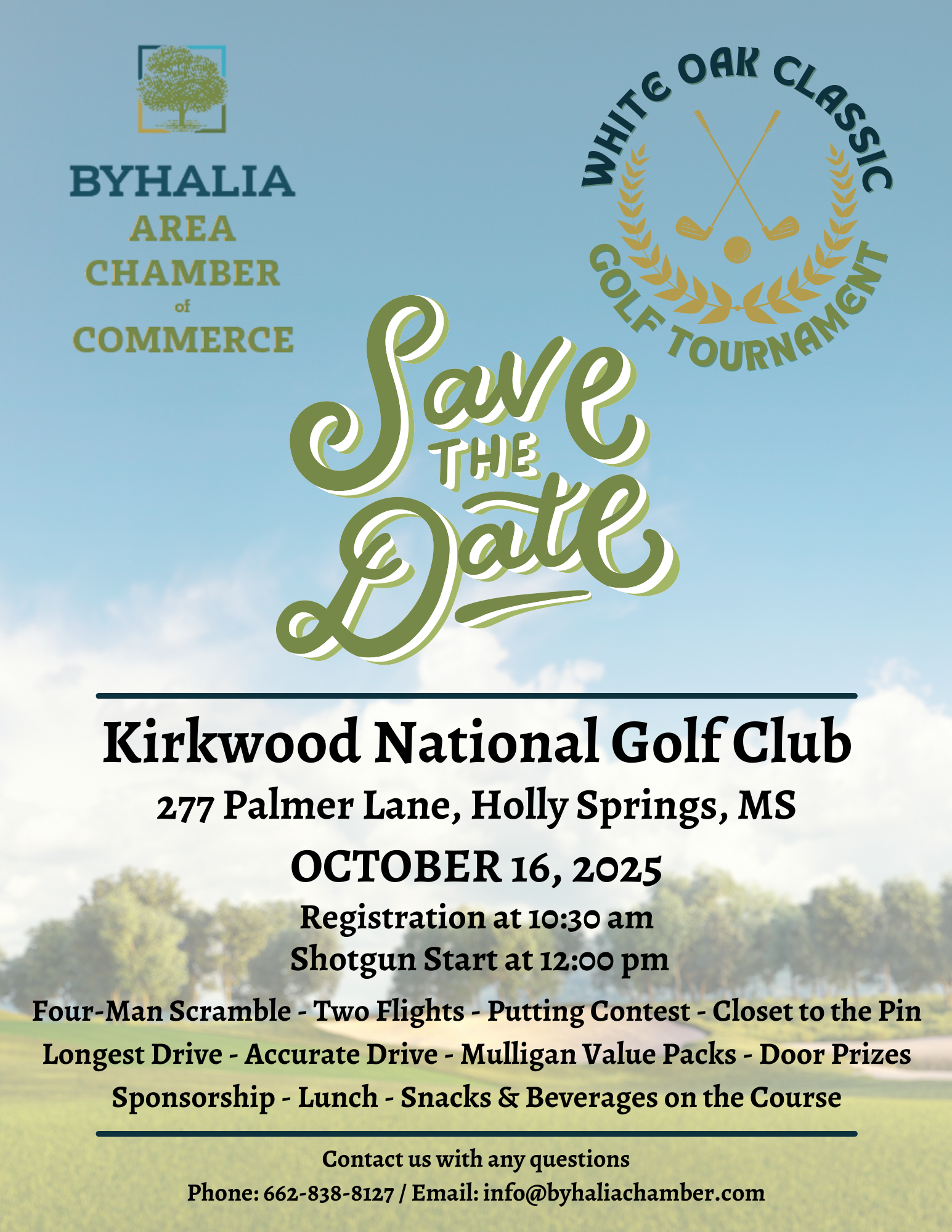 Don't miss our Annual White Oak Classic Golf Tournament! 4 Man Team $600: Includes lunch, putting contest, snacks & beverages, one sleeve golf balls per player, one mulligan pack per player. Various Sponsorships available - Call us at 662-838-8127 or email laura@byhaliachamber.com to learn how your company or organization can come out and be part of this fantastic day of golf, networking and fun!
