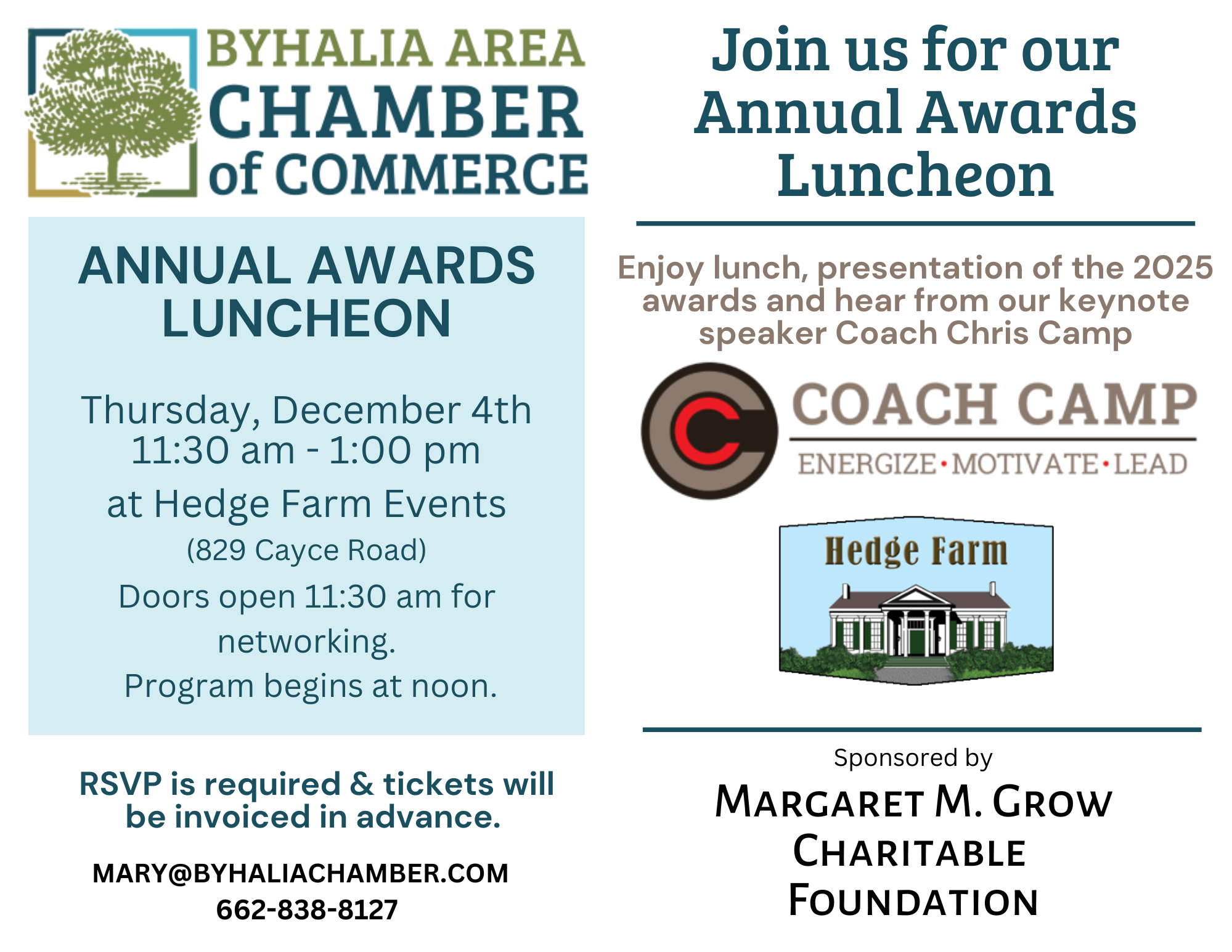 Join us for our 2025 Awards Luncheon on Thursday, December 4th from 11:30am - 1:00pm. This event will be located at Hedge Farm Events (829 Cayce Road) and catered by Short Stop Cafe & Catering. Doors open at 11:30 for networking and the luncheon will begin at noon. Our keynote speaker will be Motivational Speaker Coach Camp. We look forward to seeing you there. Your RSVP is required in advance.