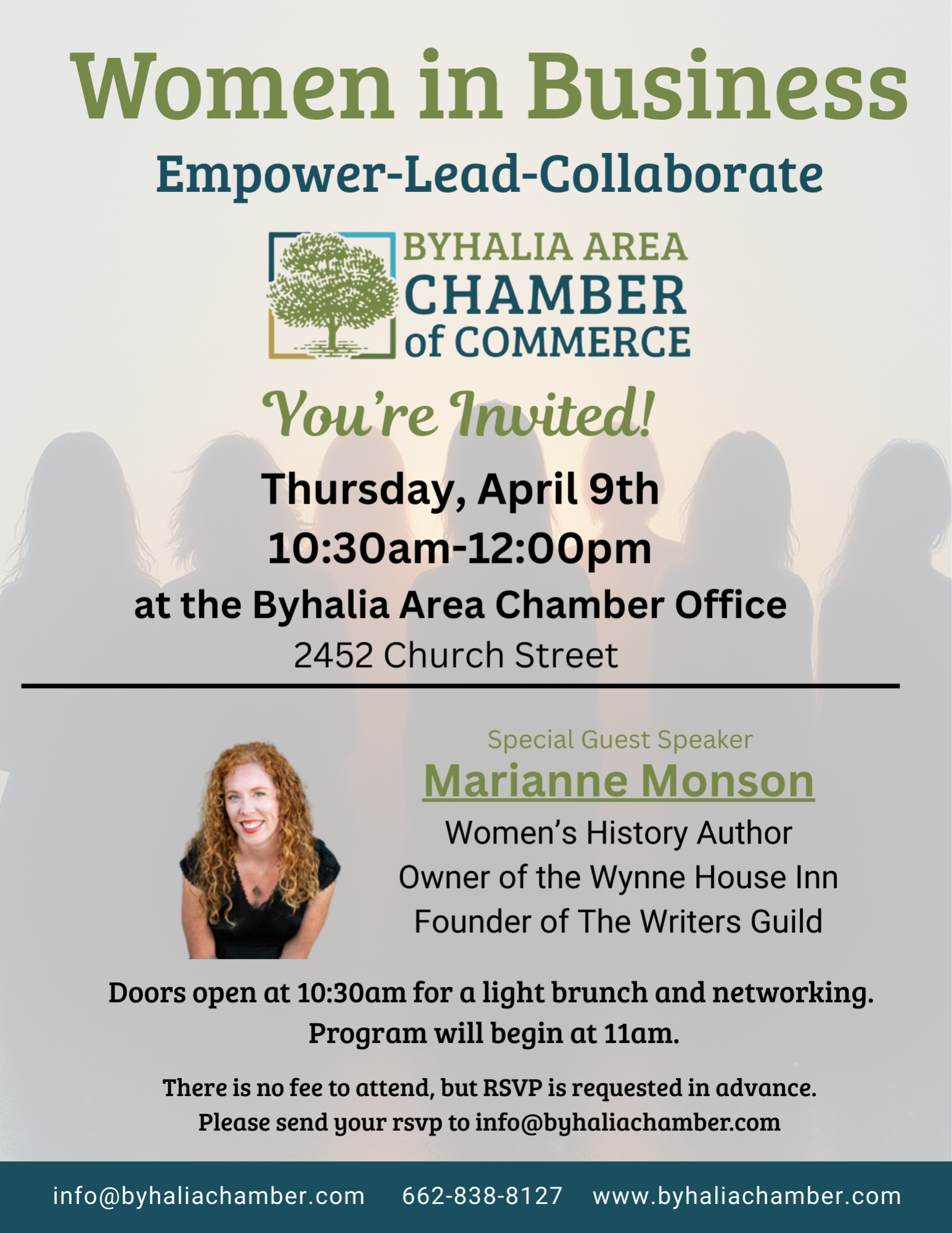 Join us Thursday, April 9th 10:30am-12:00pm for our first Women in Business designed to empower, lead and collaborate for success. We are excited to welcome Marianne Monson as our featured guest speaker this month! . Event will take place at the our office (2452 Church Street) and will include a light brunch and networking from 10:30am-11:00am, program will begin at 11:00am. There is no fee to attend, but RSVP is requested in advance. Please send your rsvp to info@byhaliachamber.com or register here online.