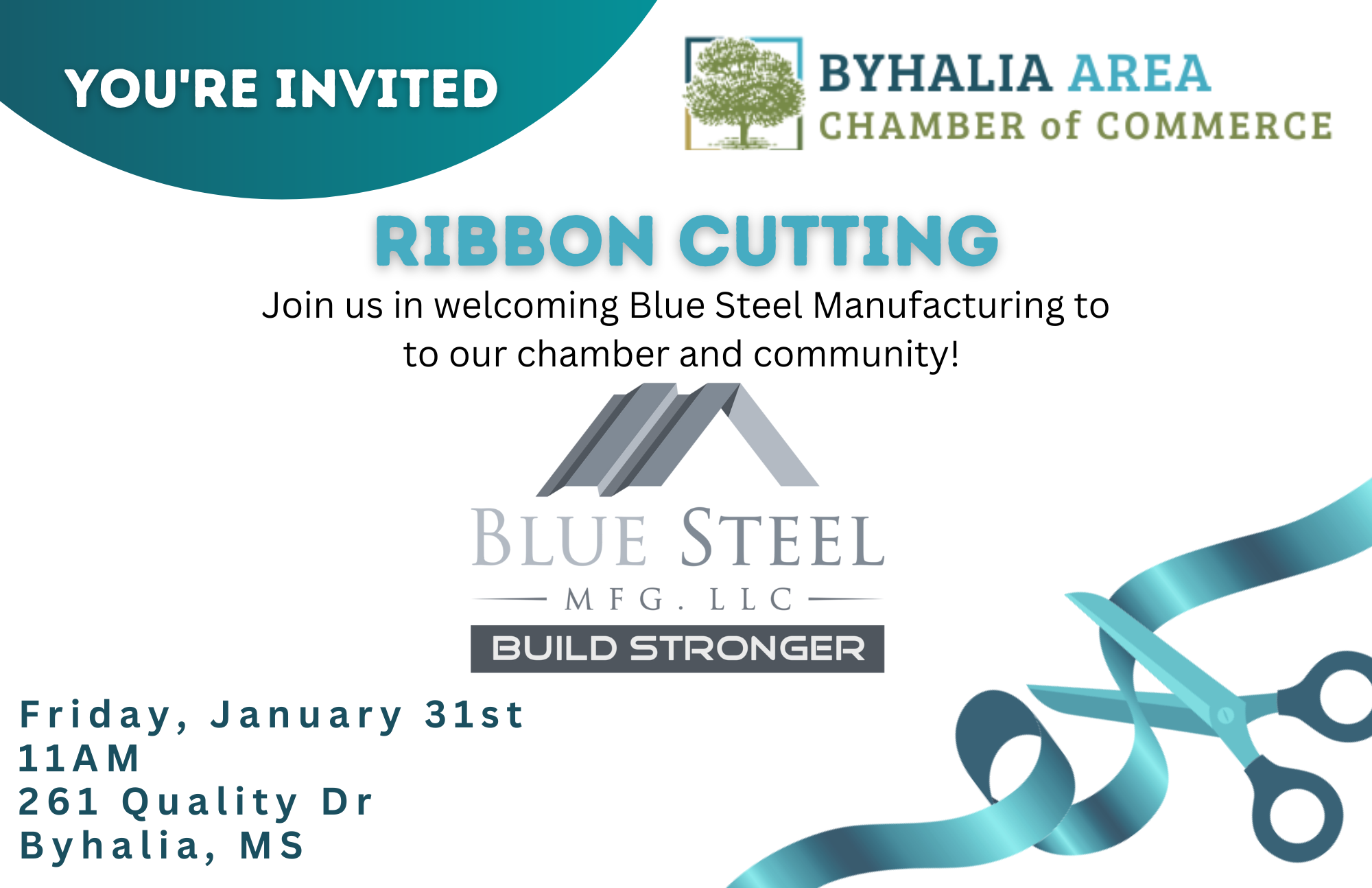Join us as we welcome and celebrate Blue Steel Manufacturing. The ribbon cutting will take place at 11AM on Friday, January 31st at their new Byhalia location.