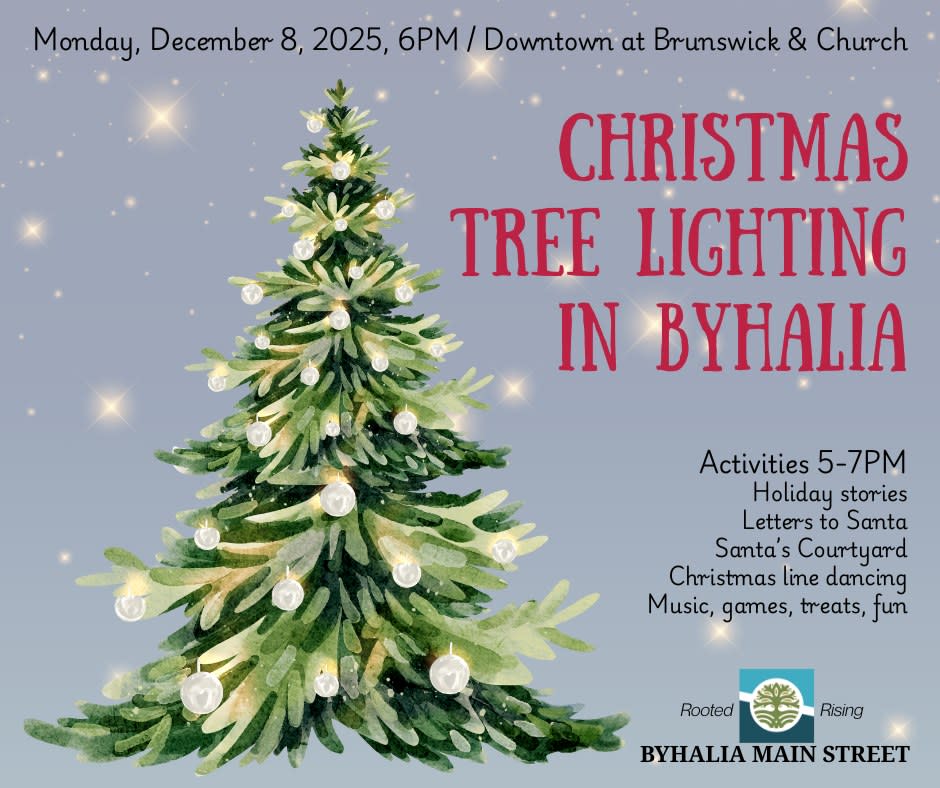 Byhalia Main Street presents Christmas Tree Lighting & Festivities, Monday, December 8th 5:00pm-7:00pm at Veteran's Park (Brunswick & Church St). They will offer a letters to Santa Station, Christmas line dance lessons, Christmas stories from Mrs. Claus, free games & treats, and visit with Santa! The official tree lighting will take place at 6:00pm.