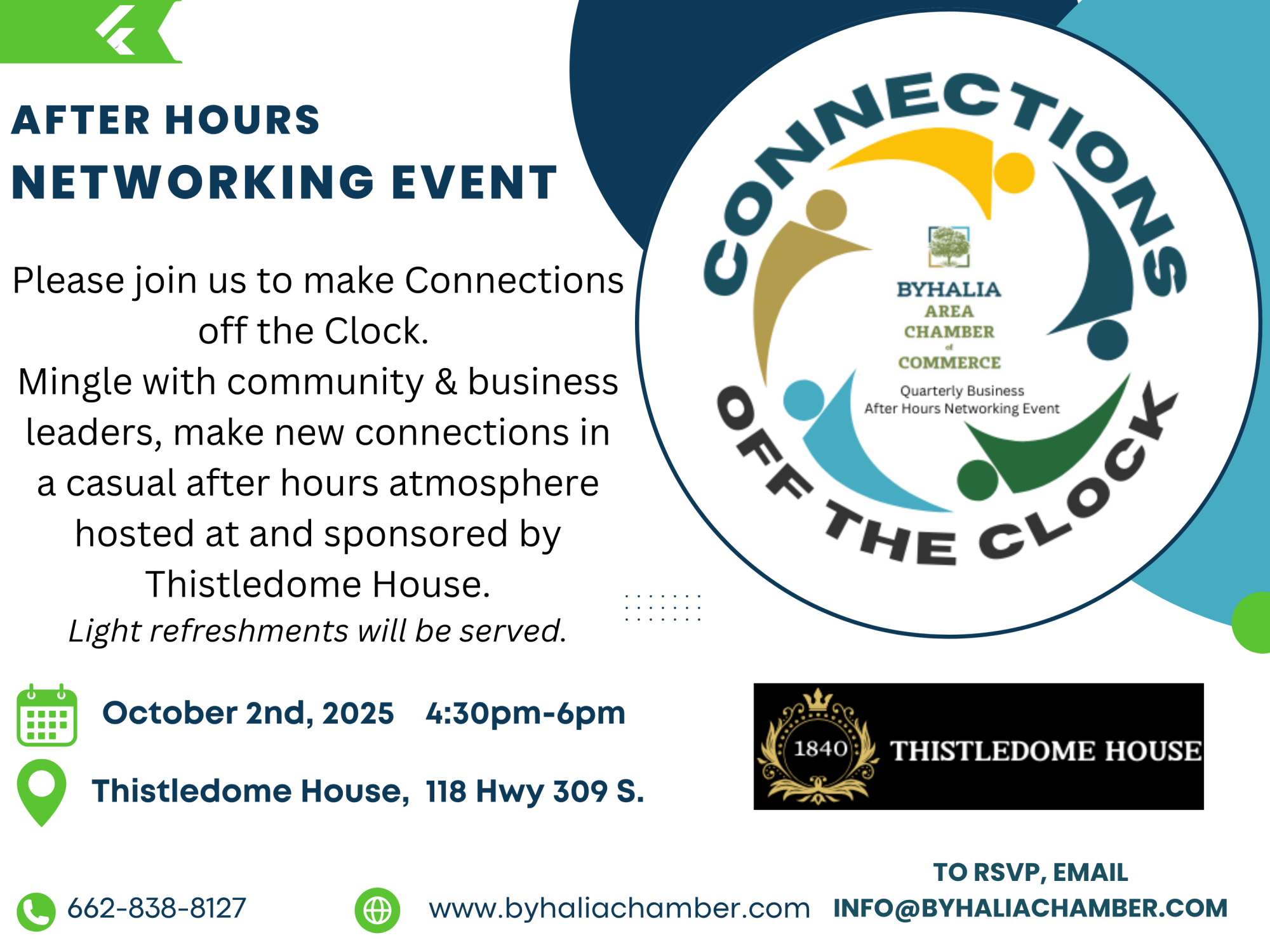Please join us October 2nd at 4:30pm to make Connections off the Clock. Mingle with community & business leaders, make new connections in a casual after hours atmosphere hosted at and sponsored by Thistledome House. Light refreshments will be served. There is no fee to attend, but RSVP is requested in advance. Please register online or send your RSVP to info@byhaliachamber.com.