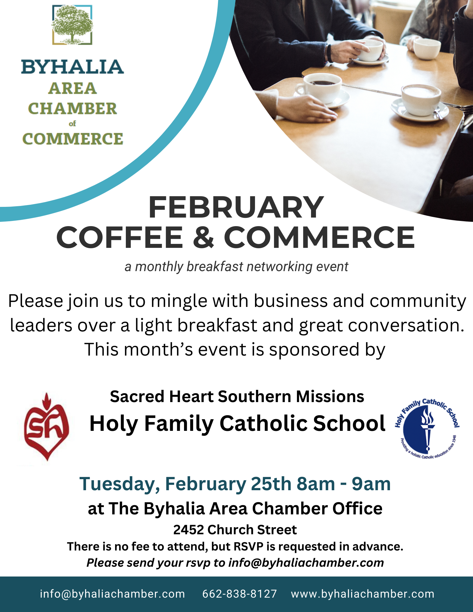 Please join us for our monthly Coffee & Commerce on February 25th where you can mingle with business and community leaders over a light breakfast and great conversation. This month's event will be sponsored by Sacred Heart Southern Missions and Holy Family Catholic School. The event will be held from 8am-9am at the Byhalia Area Chamber office. The address is 2452 Church Street. There is no fee to attend, but RSVP is requested in advance. Please send your rsvp to info@byhaliachamber.com