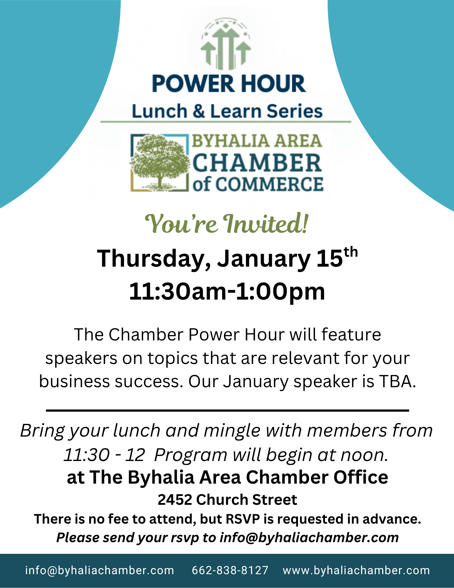 Mark your calendars for an all new Power Hour Lunch & Learn Series we are kicking off on January 15th 11:30am-1:00pm at the Chamber Office (2452 Church Street). The Chamber Power Hour will feature speakers on topics that are relevant for your business success. Our January speaker is TBA. Bring your lunch and mingle with members from 11:30am-12:00pm, program will begin at noon. There is no fee to attend, but RSVP is requested in advance. Please send your RSVP to info@byhaliachamber.com.