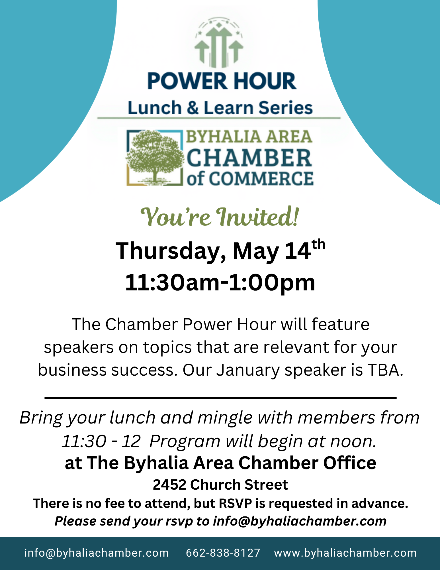 Please join us for our third Power Hour Lunch & Learn Series on May 14th 11:30am-1:00pm at the Chamber Office (2452 Church Street). The Chamber Power Hour will feature speakers on topics that are relevant for your business success. Our May speaker is to be announced. Bring your lunch and mingle with members from 11:30am-12:00pm, program will begin at noon. There is no fee to attend, but RSVP is requested in advance. Please send your RSVP to info@byhaliachamber.com.