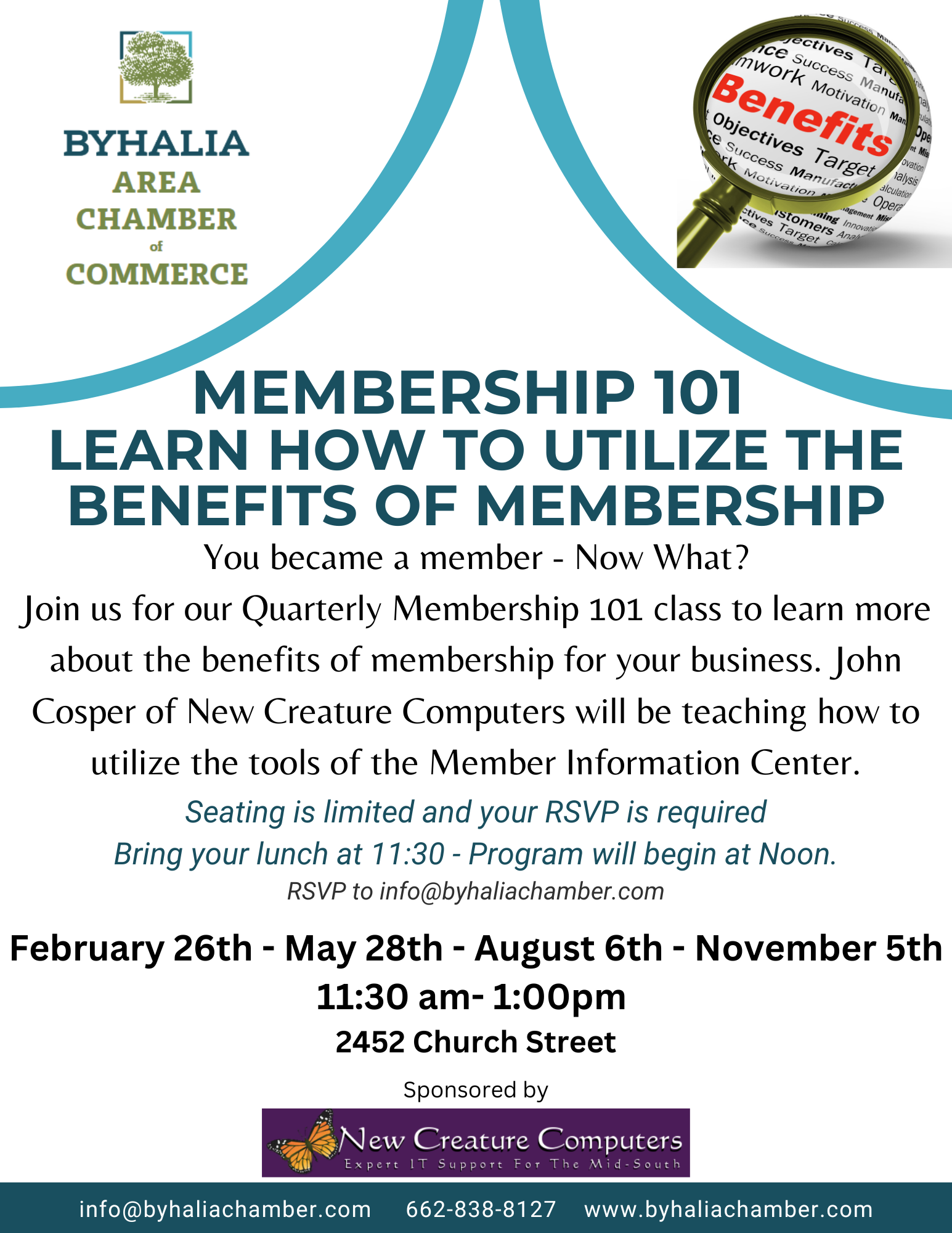 Ever wondered what to do after becoming a member? Join us on February 26th for our Quarterly Membership 101 class to learn more about your benefits of membership and the chamber. John Cosper of New Creature Computers will be teaching how to utilize the tools of the Member Information Center. Seating is limited and your RSVP is required. Bring your lunch at 11:30- the program will begin at noon.