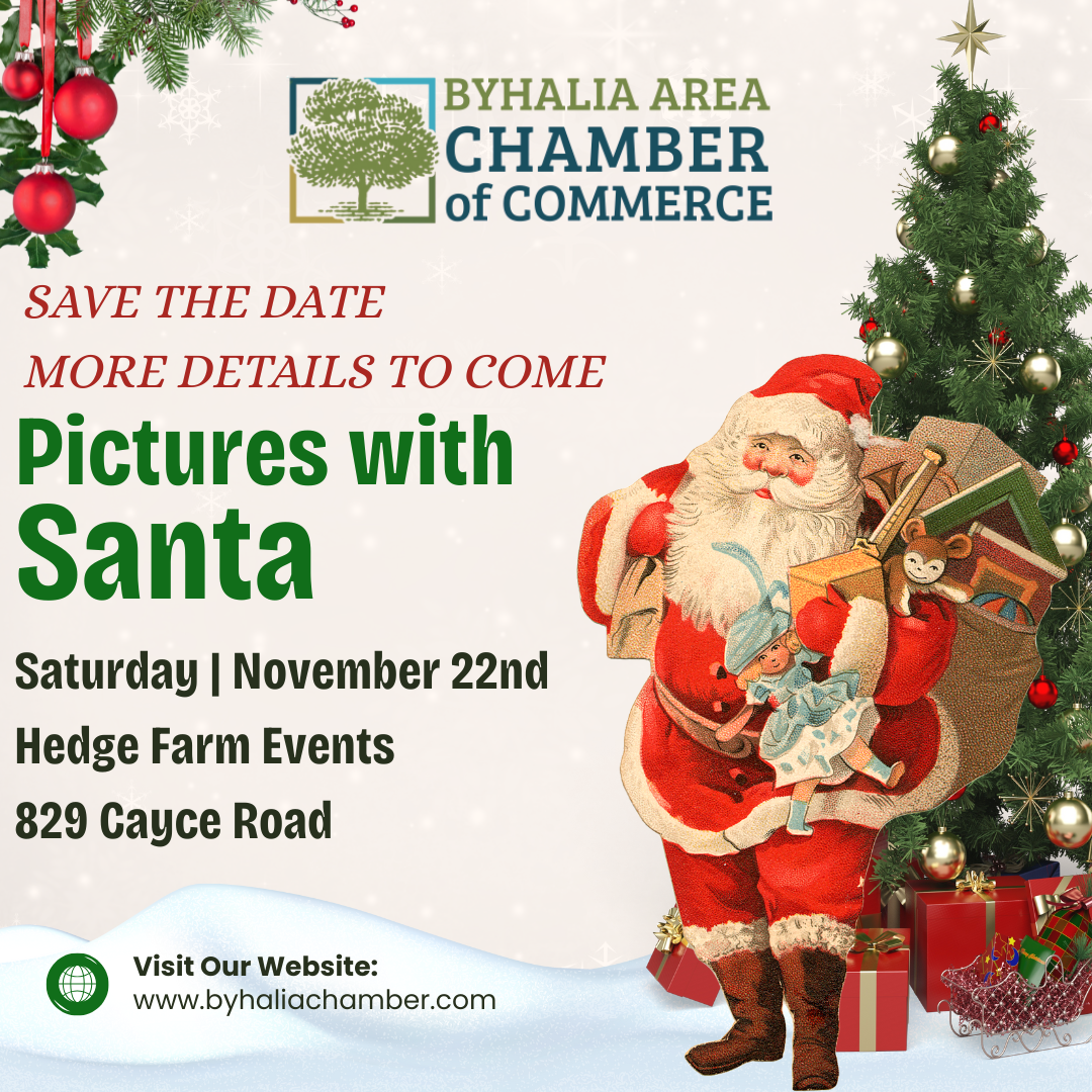 The Byhalia Area Chamber of Commerce presents Pictures with Santa at Hedge Farm Events on Saturday, November 22nd 10am-3pm. Santa Claus is coming to Byhalia! Stop by Hedge Farm to get your picture with Santa, shop the Holiday Market, & get hot chocolate!