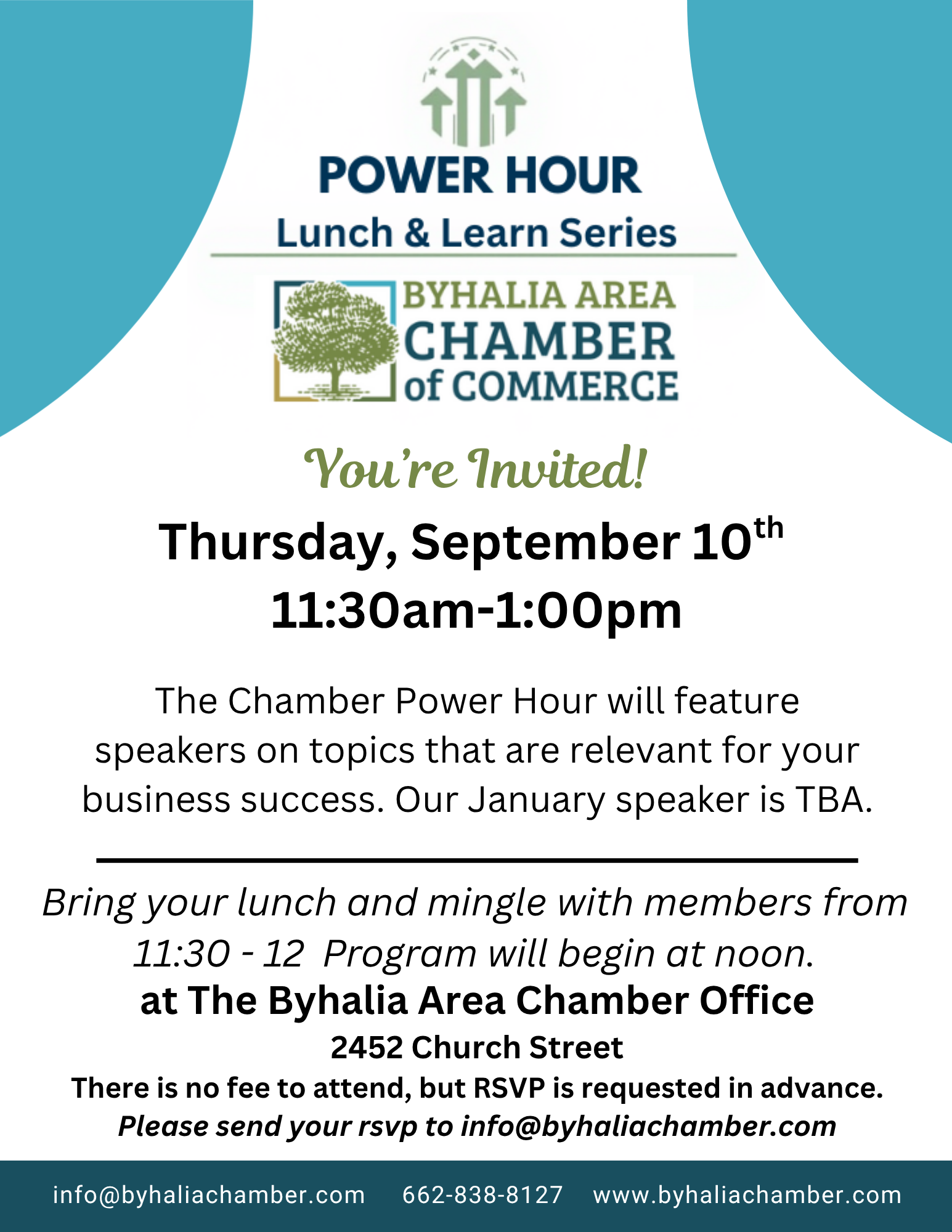 Please join us for our fifth Power Hour Lunch & Learn Series on September 10th 11:30am-1:00pm at the Chamber Office (2452 Church Street). The Chamber Power Hour will feature speakers on topics that are relevant for your business success. Our September speaker is to be announced. Bring your lunch and mingle with members from 11:30am-12:00pm, program will begin at noon. There is no fee to attend, but RSVP is requested in advance. Please send your RSVP to info@byhaliachamber.com.